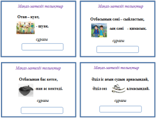 Дескриптор: Жалпы: 2 балл -мақалды толықтырып жазады-1 балл -сауатты жазады-1 балл