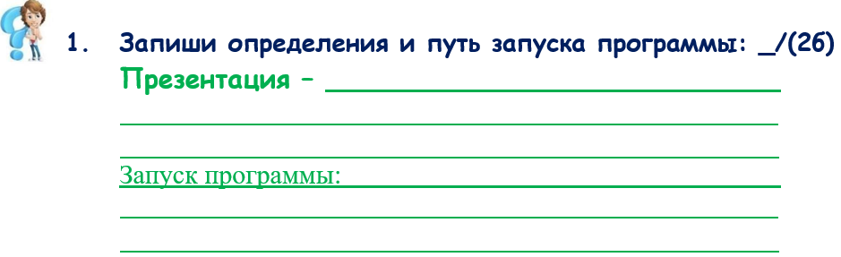 Смотрят ролик Дескриптор: -записывает определения и путь программы Дескриптор: -записывает определения Дескриптор: -определяет истинность высказываний Выполняют физминутку Дескриптор: -устанавливает соответствие Работают в парах Дескриптор: -находят слова Вспоминают правила техники безопасности за ПК Дескриптор: - создаёт презентацию, содержащую текст и изображение, - применяет дизайн Дескриптор: -выполняет интерактивные задание |