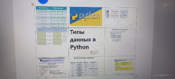 Работает с презентацией «типы данных.» - изучает новый материал, выполняет краткий конспект, записывая определения и понятия.стр 82 После проработки нового материала в презентации выполняет обратную связь с учителем по приему «Кулак-Ладонь)» Читает задание, предлагает свою идею, заслушивает участников группы, обсуждает все предложения и формирует из общего текст задания. Решает задание математически. Разрабатывает программный код для решения задания в виде линейного алгоритма на языке Python. Работает в ПО - набирает программный код, тестирует программу.