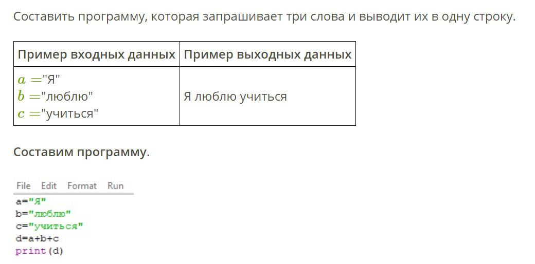 Ученики составляют программу ,к задаче Три слова и вывести их в одну строку |