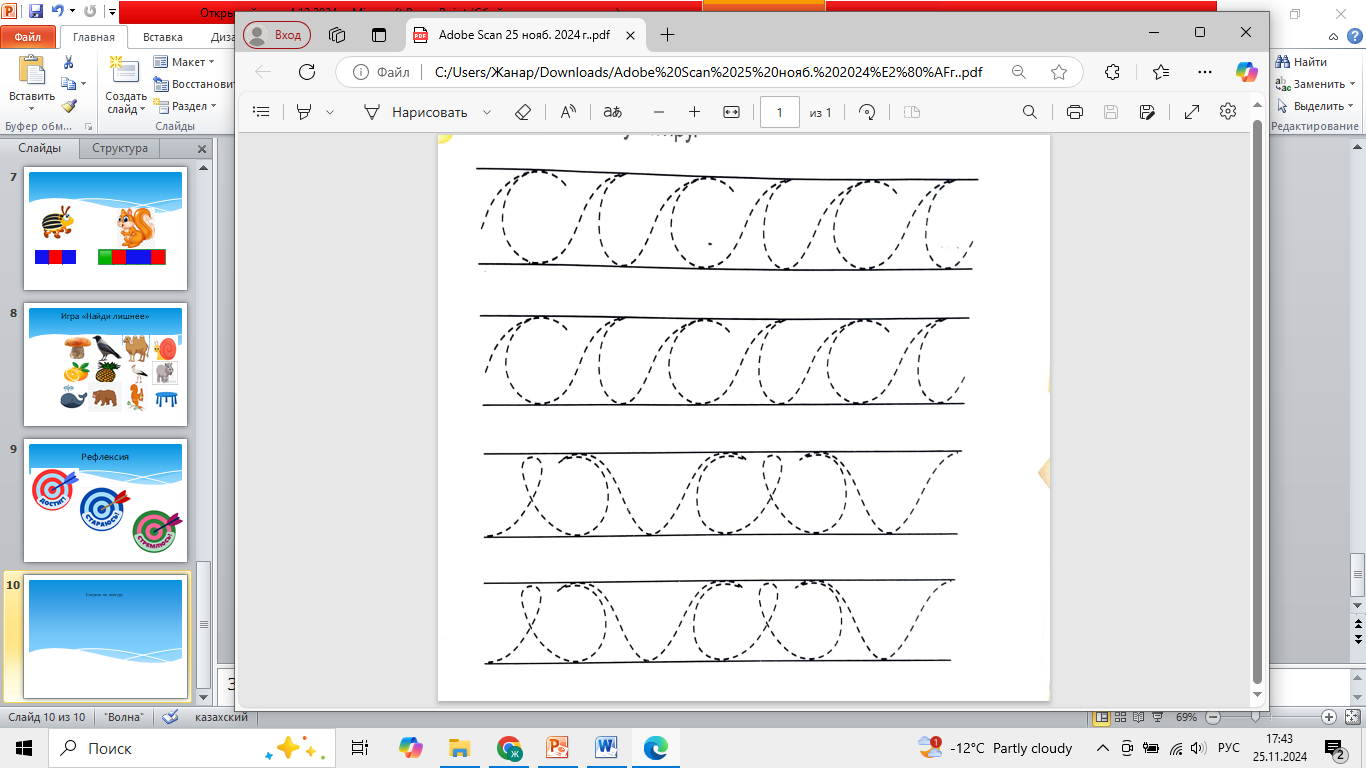 Физминутка: https://www.youtube.com/watch? Ребята, у нас еще одна работа в паре давайте сделаем звуковой анализ слов: ЖУК и БЕЛКА. Сколько гласных и согласных звуков в слове? Какое слово короткое а какое длинное? Работа со звуками Дидактическая игра «Найди лишнее» Педагог: – Зачеркните лишнюю картинку и объясните почему зачеркнули. А теперь ребята давайте сделаем пальчиковую гимнастику “Капуста” Мы капусту рубим – рубим, Мы капусту солим- солим, Мы морковку трем –трем, Мы капусту жмем-жмем, А потом мы капусту в рот кладем. А теперь мы выполним графическую работу. Соединим по контуру. Педагог показывает в воздухе движение рисунка.