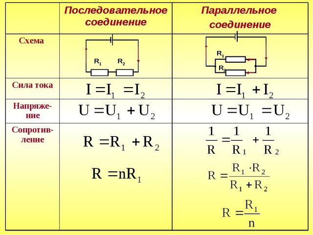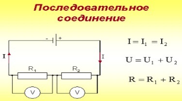 Общее сопротивление цепи при последовательном соединении равно сумме сопротивлений отдельных проводников (или отдельных участков цепи): R=R1+R2.