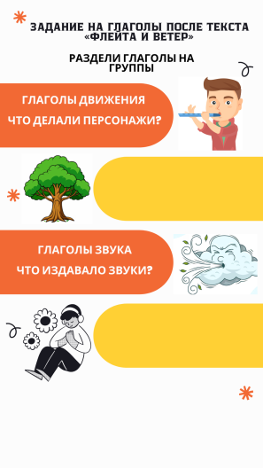 П. Словарная работа в паре«Анализ глаголов»Цель: Развитие словарного запаса, умение анализировать глаголы в тексте, понимание их роли в создании художественного образа.Внимательно перечитайте текст «Флейта и Ветер».Выпишите все глаголы, которые встретите в тексте. Разделите глаголы на группы: