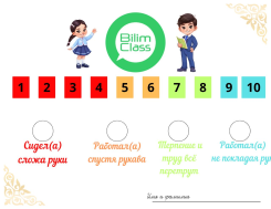 Рефлексия «Bilim Class» Ученики ставят отметку (галочку или кружок) в одном из четырех предложенных вариантов: «Сидел(а), сложа руки» (не участвовал активно, не проявлял инициативу). «Работал(а) спустя рукава» (участвовал, но не в полную силу, выполнял задания небрежно). «Терпение и труд всё перетрут» (старался, работал над ошибками, проявлял усердие). «Работал(а) не покладая рук» (активно участвовал, выполнял все задания, проявил максимум старания). |