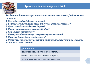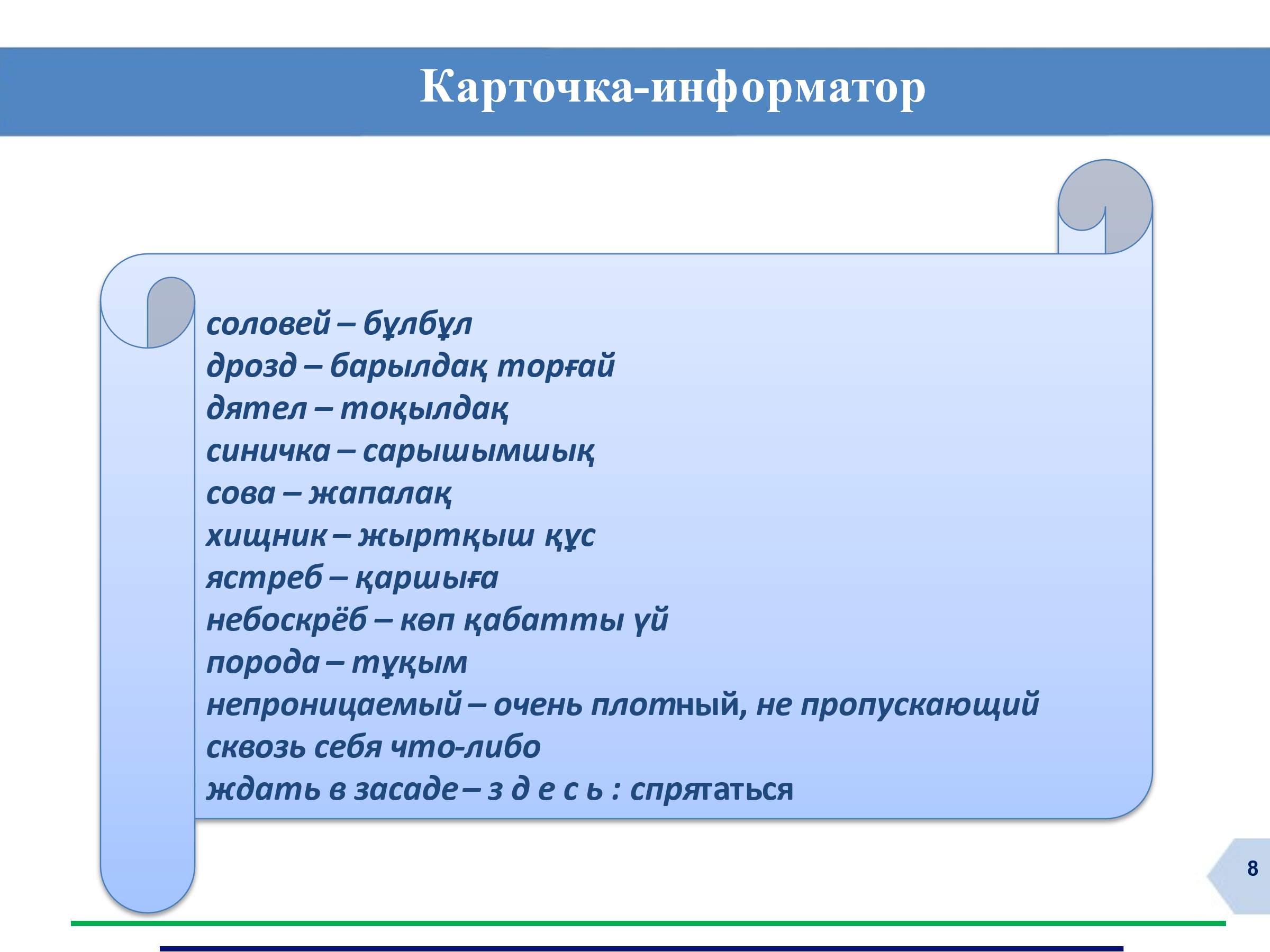 III. Изучение нового материала. 1. К.Предтекстовая работа. Соловей-бұлбұл Дрозд-барылдақ торғай Дятел-тоқылдақ Сова-жапалақ Ястреб-қаршыға Мышка-тышқан синичка – сарышымшық сова – жапалақ хищник – жыртқыш құс небоскрёб – көп қабатты үй порода – тұқым непроницаемый – очень плотный, не пропускающий сквозь себя что-либо 2.Текстовый этап. К) Упр. 1 Послушайте рассказ М. М. Пришвина ,читайте вместе с автором. Каждая группа пересказывает; объясняет свою часть рассказа. IV. Освоение изученного материала. 1-ая группа.Упр. 2. Разделите данные вопросы на «тонкие» и «толстые». Дайте на них ответы. 2-ая группа Упр. 3.Составьте картинный план к рассказу,используя данные рисунки. 3-я группа. Упр. 5. Сравните прочитанные рассказы «Ласточки на паровозе» и «Этажи леса». Используя диаграмму Венна, объясните, что их объединяет и чем они отличаются; 4-ая группа. Создайте презентацию на тему:«Берегите птиц!», использйте данные рисунки.