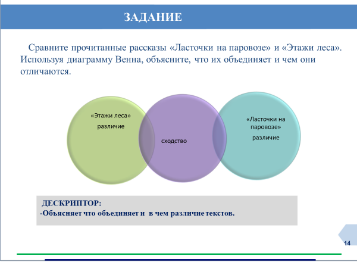 Ученики выполняют групповую работу. 1-ая группа -делят вопросы на «тонкие» и «толстые»; -верно отвечают на «тонкие» вопросы; -верно отвечают на «толстые» вопросы; 2-ая группа -составляют картинный план к рассказу; -верно определяют последова тельность событии; -пересказывают текст события. 3-я группа. -строят диаграмму Венна; -находят отличие произвед-ний; -находятсходствопроизведений. 4-ая группа. -создают презентацию; -раскрывают тему презентации; -приводят аргументы.