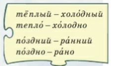 Составьте текст, заменяя выделенные слова антонимами. Опоздали. Вечером (утром) я с товарищем пошел к поезду. До станции было далеко (близко). Дул встречный холодный (тёплый) ветер, и идти было трудно (легко). Пришли мы к станции, а поезд отходит (подходит). Как плохо (хорошо), что мы опоздали (не опоздали). Два охотника Среди тайги, в селе, живут два врага (друга), два молодых (старых) охотника – дед Егор и дед Иван. Дед Иван– маленький (большой), и зверя ему подавай побольше: медведя, кабана. Дед Егор большой (маленький), зверя любит невеликого: лису, белку. Дом у деда Ивана новый (старый), но большой. У Егора домик некрасивый (красивый). Оба охотники неизвестные (известные). Солнечный осенний день Сегодня теплый солнечный день. Стоит прекрасная погода. Дует слабый ветерок. Небо чистое, высокое. Под ногами сухо. Веселая пора. |