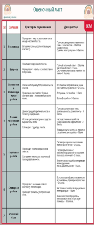 1. Вставить пропущенные слова Дескриптор: Определяет смысловые связи между частями текста. Вставляет слова, соответствующие контексту. Критерии: Полное совпадение вставленного слова с контекстом – 1 балл за каждое слово. Ошибки или пропуски – 0 баллов. 2. Ответить на вопросы Дескриптор: Понимает содержание текста. Формулирует ответы в соответствии с вопросами. Критерии: Полный и точный ответ – 2 балла. Частичный ответ – 1 балл. Отсутствие ответа или ответ не по теме – 0 баллов. 3. Выполнение упражнения на мягкий знак (ь) и твёрдый знак (ъ) Дескриптор: Различает случаи употребления ь и ъ знаков. Правильно расставляет буквы в соответствии с правилами русского языка. Критерии: Все ошибки исправлены и знаки расставлены правильно – 2 балла. Допущены 1–2 ошибки – 1 балл. Более 2 ошибок – 0 баллов. 4. Творческая работа Дескриптор: Демонстрирует оригинальность и полноту содержания. Использует литературные средства выразительности. Соблюдает структуру текста. Критерии: Полное соответствие теме, оригинальность, грамотность – 3 балла. Несущественные ошибки в содержании или оформлении – 2 балла. Тема раскрыта частично, имеются стилистические ошибки – 1 балл. Содержание не соответствует заданию – 0 баллов. 5. Перевод текста и пересказ в хронологическом порядке Дескриптор: Переводит текст с сохранением смысла. Составляет пересказ в логической последовательности. Критерии: Перевод и пересказ выполнены полностью и точно – 3 балла. Перевод выполнен с незначительными неточностями, пересказ логичный – 2 балла. Значительные ошибки в переводе или нарушение последовательности – 1 балл. Перевод и пересказ выполнены неправильно – 0 баллов. 6. Словарная работа Дескриптор: Определяет значение слов по контексту или словарю. Приводит примеры употребления слов. Критерии: Все слова разобраны и правильно истолкованы, примеры корректны – 2 балла. Частичные ошибки в определении или примерах – 1 балл. Значения слов определены неправильно или отсутствуют примеры – 0 баллов. Критериальное оценивание Взаимооценивание