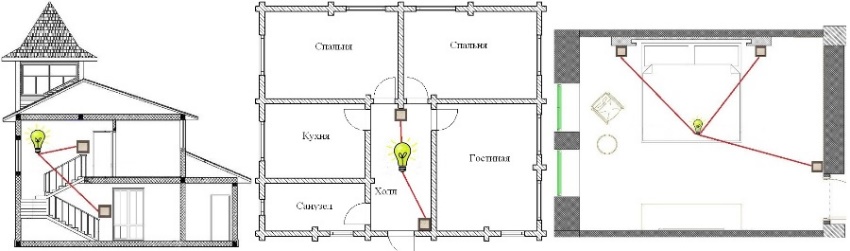 К каждому выключателю подходят три провода. Соединения производятся в соответствии со схемой:
