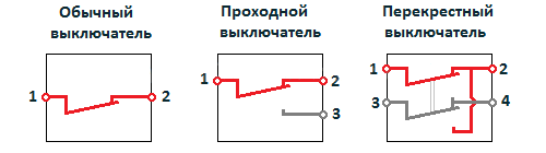 Особенности конструкцииКонструкция проходного выключателя отличается от классической конструкции наличием трех контактов вместо двух.