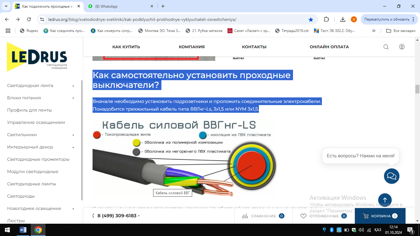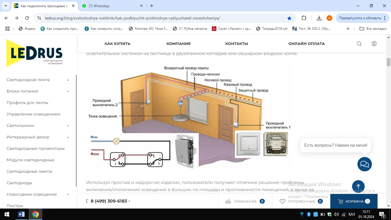 Монтажная схема освещения, электроприборы, набор электромонтажных инструментов, бокс с нулевой шиной, кабель. |