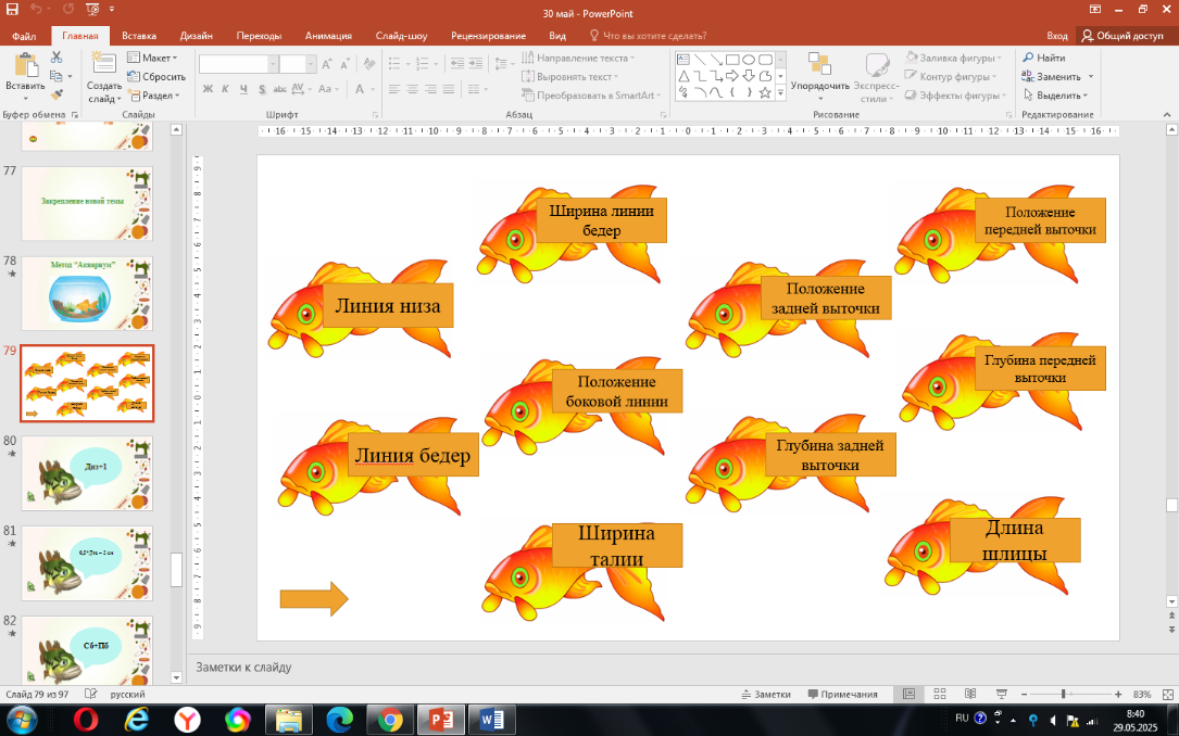 Для открытия новой темы урока, скрытой под изображением платья, студентам необходимо пройти повторение ранее изученного материала по теме «Расчёт и построение женских брюк», выполненное поэтапно.