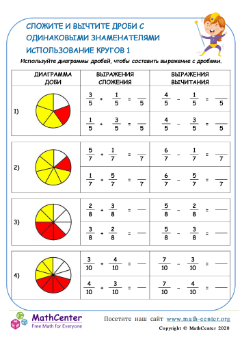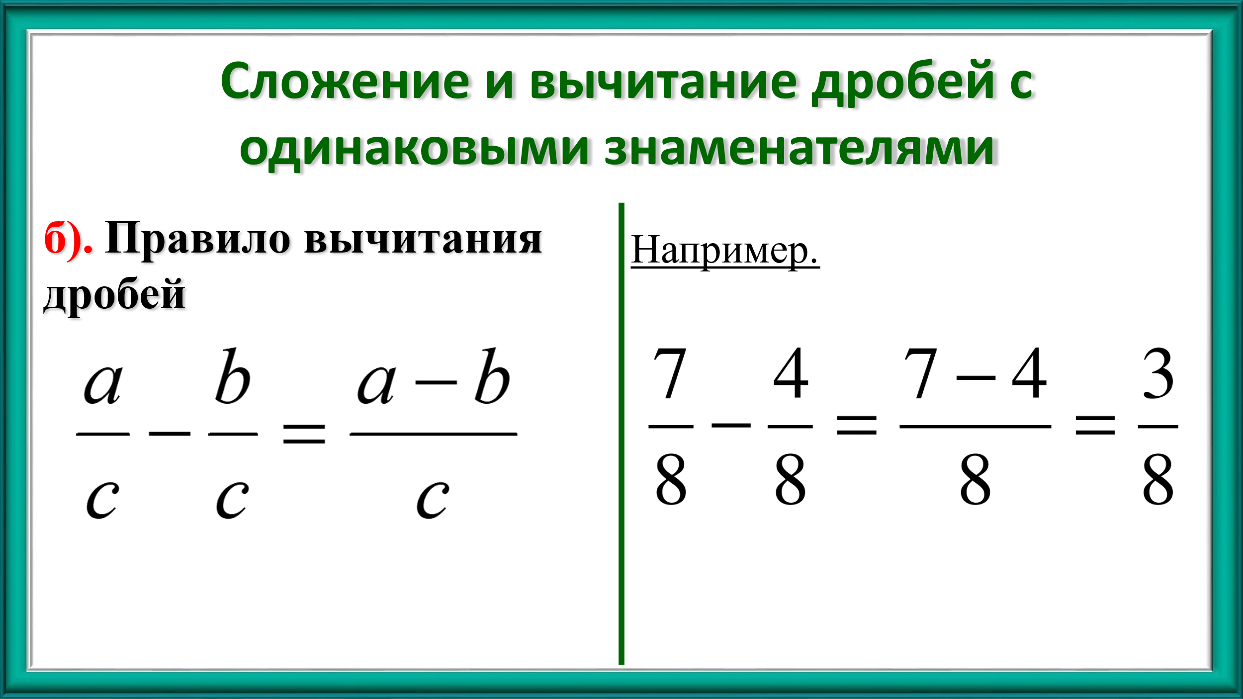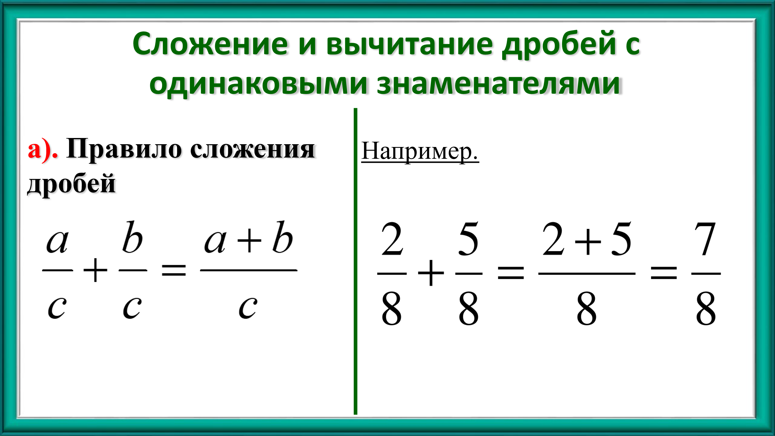 Объяснение сложения и вычитания дробей с одинаковыми знаменателями, примеры
