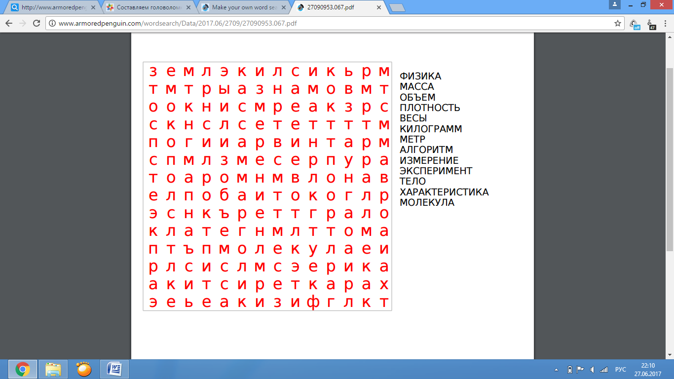 Приложение1. Цор http://www.armoredpenguin.com/wordsearch/ Рычажные весы. Набор тел разной плотности и разного объема. Приложение 2 Стеклянный стакан, шарики разного размера, песок, вода. Сигнальные карточки. |