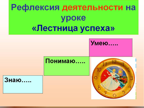 (К) Рефлексия: Учитель предлагает ученикам «Лесенку успеха» Прикрепить свои часики на ту ступеньку, где они считают, что знают… Понимают.. Умеют….