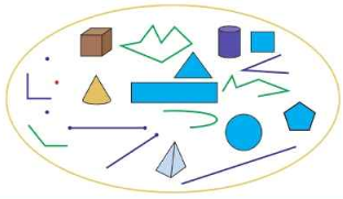 Вот колпак на голове – Это клоун на траве. Но колпак не пирамида Это сразу, братцы, видно: Круг в основе колпака. Как же звать его тогда? (Конус). - дети выходят к доске показывают отгаданную фигуру, называют ее особенности - какие еще геом. фигуры знаем - как называются фигуры, у которых много углов и сторон? - какие из этих фигур можно назвать многоугольником? - какая фигура осталась не отгаданной? - как она называется? - какие виды углов вы знаете? - какой угол меньше прямого угла? - какой угол больше прямого угла? Формулируют тему урока, определяют цель урока. - о чем будем говорить сегодня на уроке? 4. Вводное задание на подготовку к изучению нового. (К) Работа в коллективе. Дано множество геометрических фигур. - Сколько элементов в данном множестве? Назови их. - Распредели по множествам его элементы. - Придумай название полученным множествам - множество объёмных фигур - плоских фигур - линий - углов