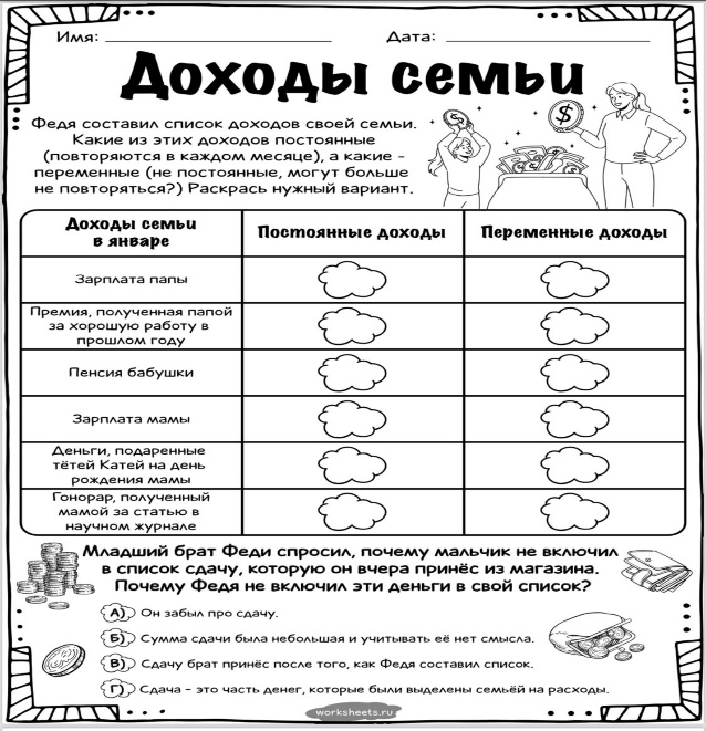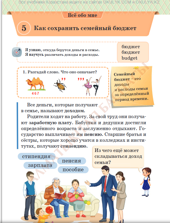 (К) Работа в коллективе. Беседа: - Как люди сохраняют семейный бюджет? - Откуда в твоей семье появляются одежда, продукты и предметы быта? - В чём смысл пословиц, которые приведены ниже? Что такое семейный бюджет?