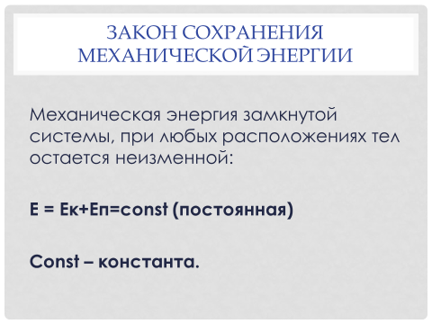 Учащиеся записывают формулы расчета для потенциальной и кинетической энергий,определяют полную энергию системы в различных состояниях,применяют закон сохранения энергии для процессов в замкнутых системах; выражают неизвестную величину из закона сохранения энергии; выполняют работу с единицами измерений; указывают переходы энергии из одного вида в другой в различных физических процессах, объясняют причину потери энергии системой тел. |