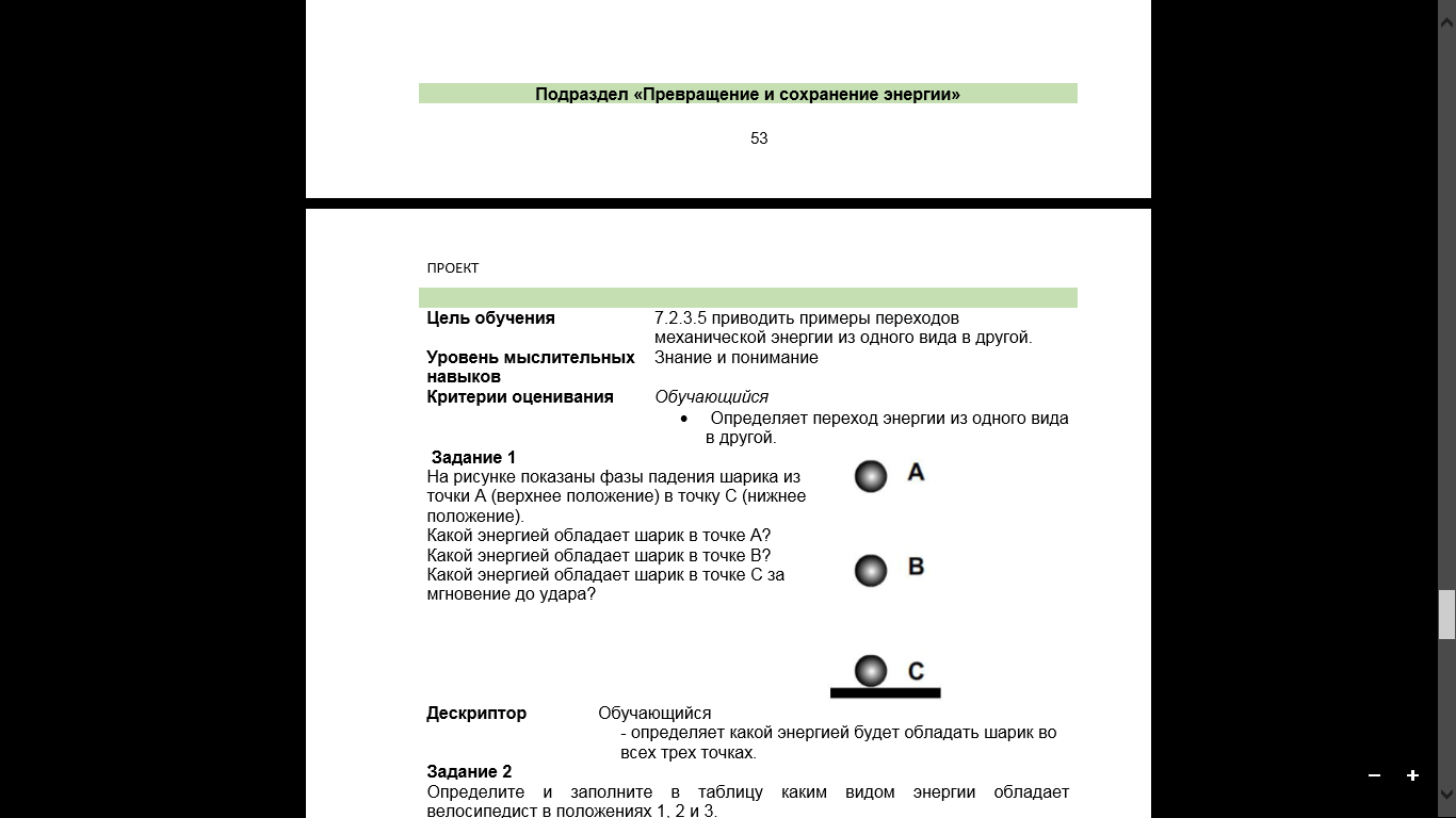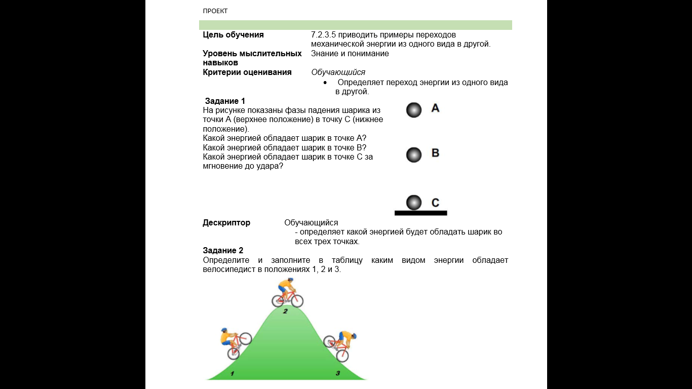 в срок СОЗДАНИЕ КОЛЛАБОРАТИВНОЙ СРЕДЫ (играет тихая музыка) РАЗМИНКА «Подари тепло другу» Предлагаю всем встать в круг, и чтобы настроиться на позитивное начало урока, подарить друг другу по 1 пожеланию. РЕФЛЕКСИЯ НА НАЧАЛО УРОКА Перед Вами на партах лежат цветные стикеры, на которых каждый из вас сейчас напишет свое имя и закрепит этот стикер на одном из трех облачек: отличное настроение, нейтральное настроение и нет настроения. ДЕЛЕНИЕ НА ГРУППЫ с помощью брелоков ІІ.Актуализация знаний. Обучение партнера (метод) Задания по группам. Критерии оценивания Обучающийся - Определяет переход энергии из одного вида в другой. Задание 1 На рисунке показаны фазы падения шарика из точки из точки А (верхнее положение) в точку С (нижнее положение). Какой энергией обладает шарик в точке А? Какой энергией обладает шарик в точке В? Какой энергией обладает шарик в точке С за мгновение до удара? Дескриптор Обучающий - какой энергией будет обладать шарик во всех трех точках Задание № 2 О