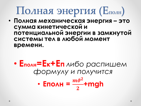 либо распишем формулу и получится Еполн = +mgh Все зависит от условия задач Слово «энергия» мы используем очень часто. Так, для работы электродвигателей нужна электрическая энергия. Двигатели автомобилей работают, используя энергию, выделяющуюся при сгорании топлива. Живые организмы (в том числе человек) могут совершать работу, так как используют энергию пищи. При работе гидроэлектростанций используется энергия падающей воды. При совершении механической работы энергия тел обязательно изменяется: у одних тел уменьшается, у других – увеличивается. Например, при подъёме кирпичей энергия грузчика уменьшается, а энергия кирпичей увеличивается. Это подтверждается тем, что чем выше они подняты, тем большую механическую работу смогут произвести (например, когда упадут, подобно камню на рисунке с орехом). Энергия грузчика уменьшается, так как его способность поднимать новые кирпичи всё меньше.