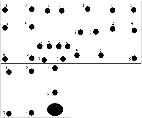 Соединить точки линиями: 1) 1-2-4, 3-4-6-5; 2) 1-2, 1-4, 2-5, 3-4, 5-6, 3-7, 6-8; 3) 1-4, 1-5, 2-3; 4) 1-2-4, 3-4-5; 5) 1-3-2-4; 6) 1-2.
