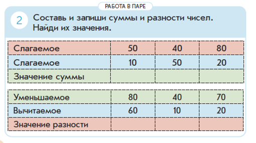 1.2.1.1 ** Составлять, читать, записывать и распознавать числовые выражения (суммы, разности). |