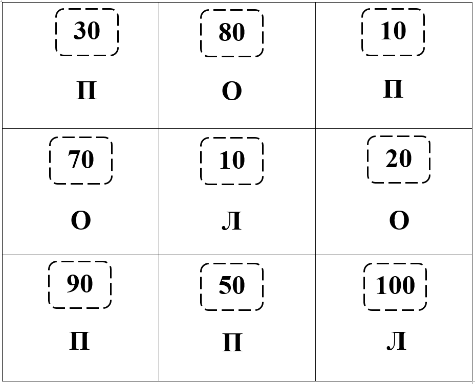Верхний ряд – назвать цифру. Нижний ряд обозначает руку, Л – левая, П- правая, О – обе. |
