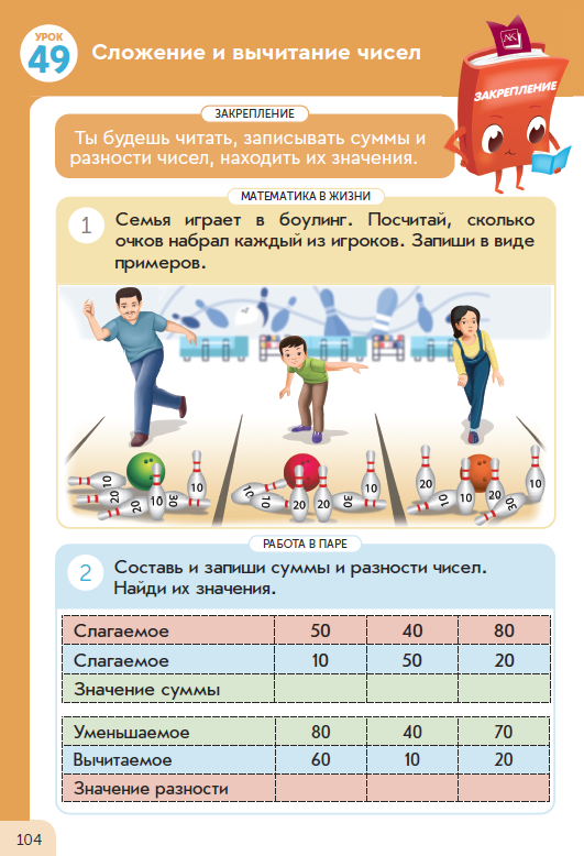 1.2.1.1 ** Составлять, читать, записывать и распознавать числовые выражения (суммы, разности). 1.5.2.2 **Использовать знаки «+», «-», «=». 1.5.2.4 Использовать названия компонентов действий сложения и вычитания при чтении и записи выражений. |