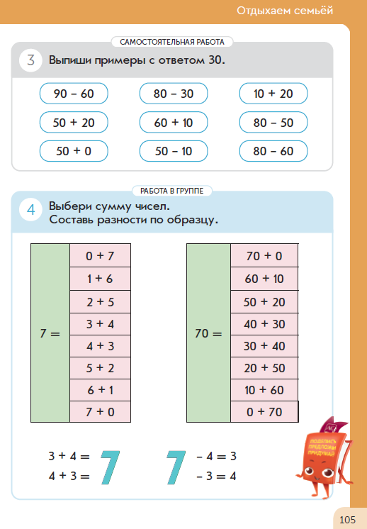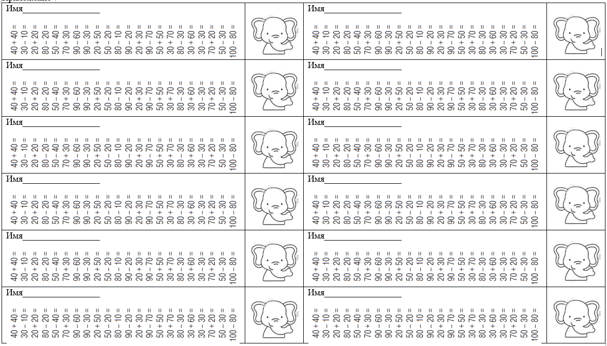 Все будут составлять, читать, записывать и распознавать числовые выражения (суммы, разности), использовать знаки «+», «-», «=», использовать названия компонентов действий сложения и вычитания при чтении и записи выражений. Большинство смогут + и – десятки, составлять обратные выражения с десятками. Некоторые смогут решить логическое задание. |