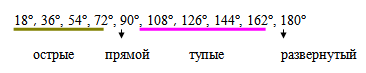 психологической атмосферы: - Французский писатель XIX столетия Анатоль Франц однажды заметил, что: «Учиться можно только весело. Чтобы переваривать эти знания, нужно поглощать эти знания с аппетитом». Давайте сегодня на уроке будем следовать этому совету. 1.2. Мозговой штурм. -Давайте вспомним прошлый урок. Цель: вспомнить предыдущие знания по теме «Угол». - А сейчас вас ждёт следующее задание. На экране записаны величины углов. - На какие группы их можно разбить?