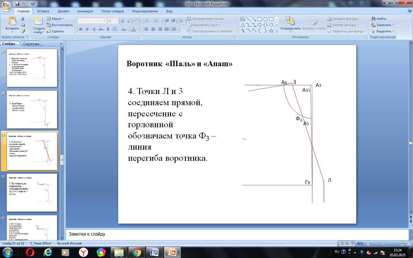 Точки Л и 3 соединяем прямой, пересечение с горловиной обозначаем точка Ф3 – линия