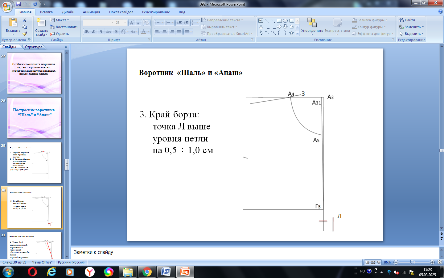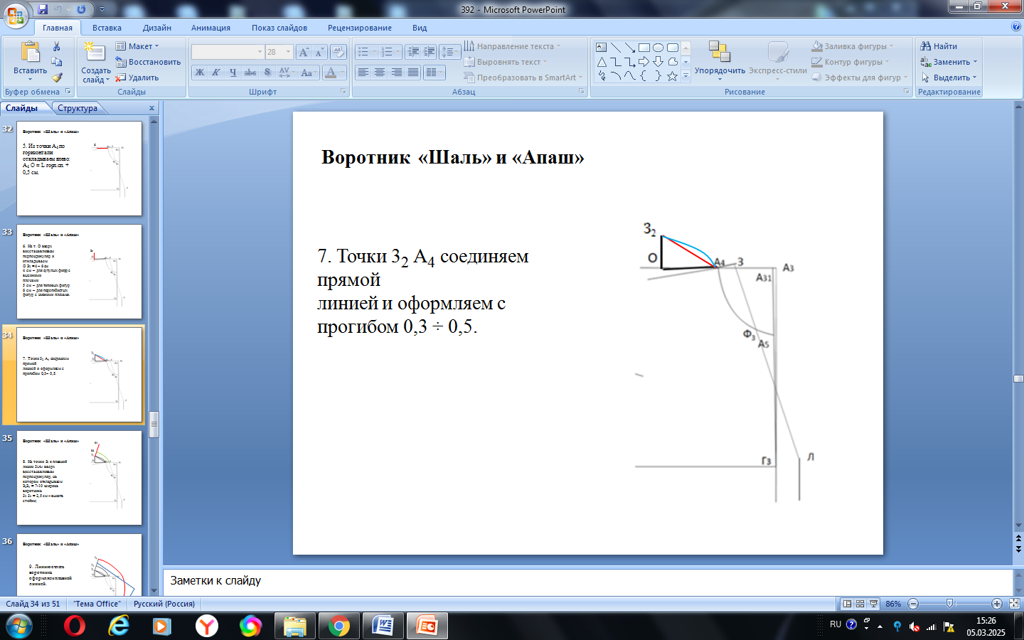 Из точки 32 к плавной линии 32А4 вверх восстанавливаем перпендикуляр, на котором откладываем З2З4 = 7-10 ширина воротника 32 33 = 2,5 см – высота стойки;