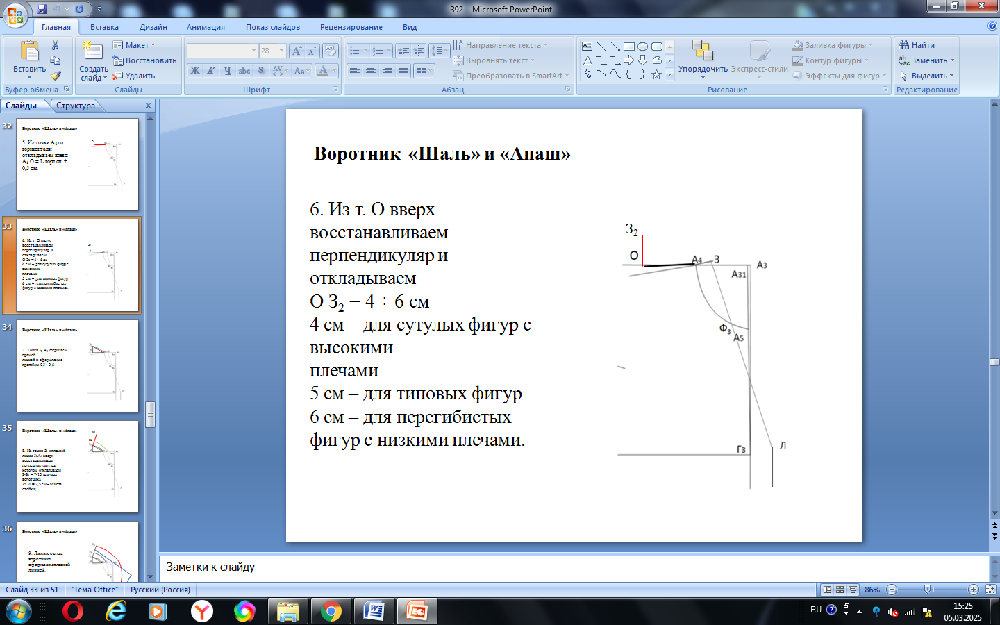 Из т. О вверх восстанавливаем перпендикуляр и откладываем О З2 = 4 ÷ 6 см 4 см – для сутулых фигур с высокими плечами 5 см – для типовых фигур 6 см – для перегибистых фигур с низкими плечами.