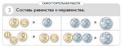 Производят различные операции с монетами 1 тг, 2 тг, 5 тг, 10 тг, 20 тг Используют понятия, которые применяются при сравнении чисел, предметов, цены товара. |