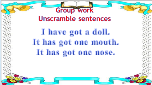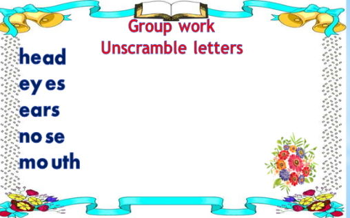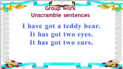 Group work Unscramble letters Teacher will give to the students parts of the words and they should find other parts of the words Group work Unscramble sentences Teacher will give to the students papers with the words and they should make correct sentences with that words |