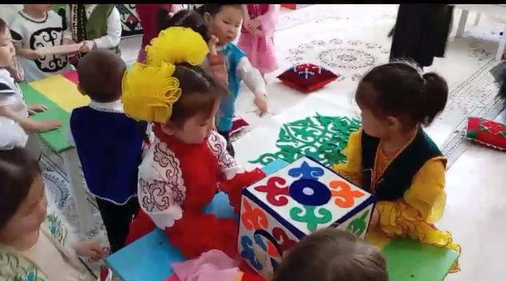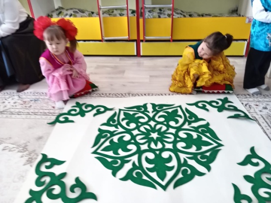 Тәрбиеші балаларды қазақтың ұлттық ою-өрнектерімен таныстырады. Ұлттық ою-өрнек туралы толық мәліметтер береді.