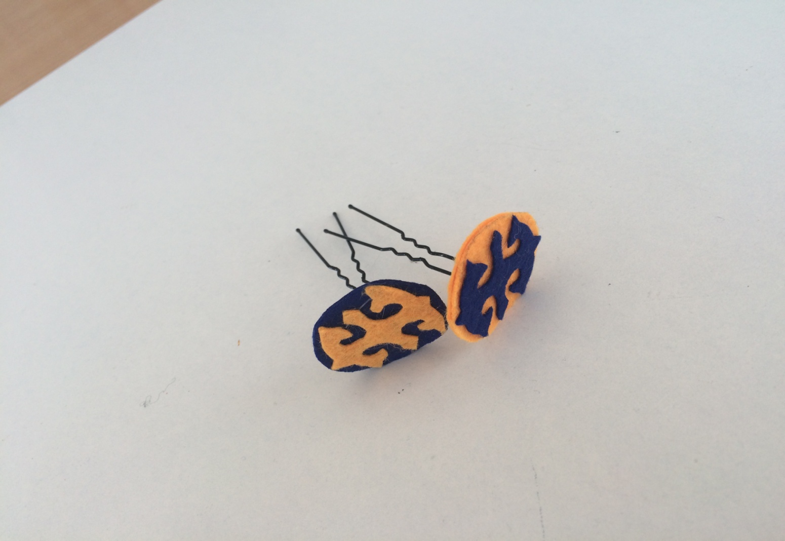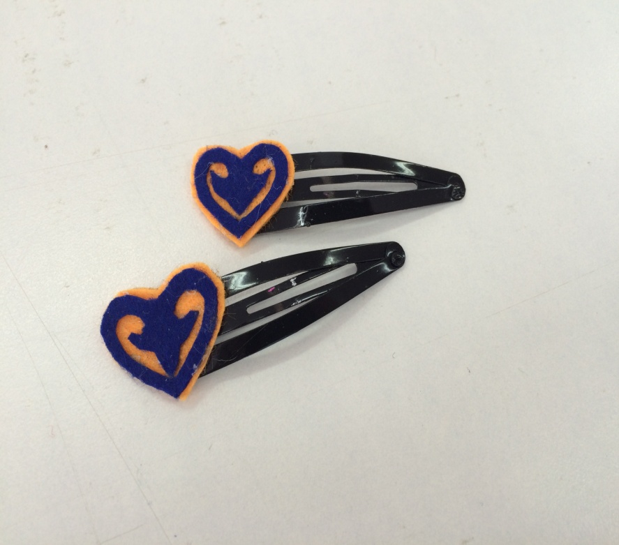 Қазақи нақыштағы шаш қыстырғыштар. Пішіні: Ромб және жүрекше. Қолданылған ою түрі: Қошқармүйіз, түйетабан.