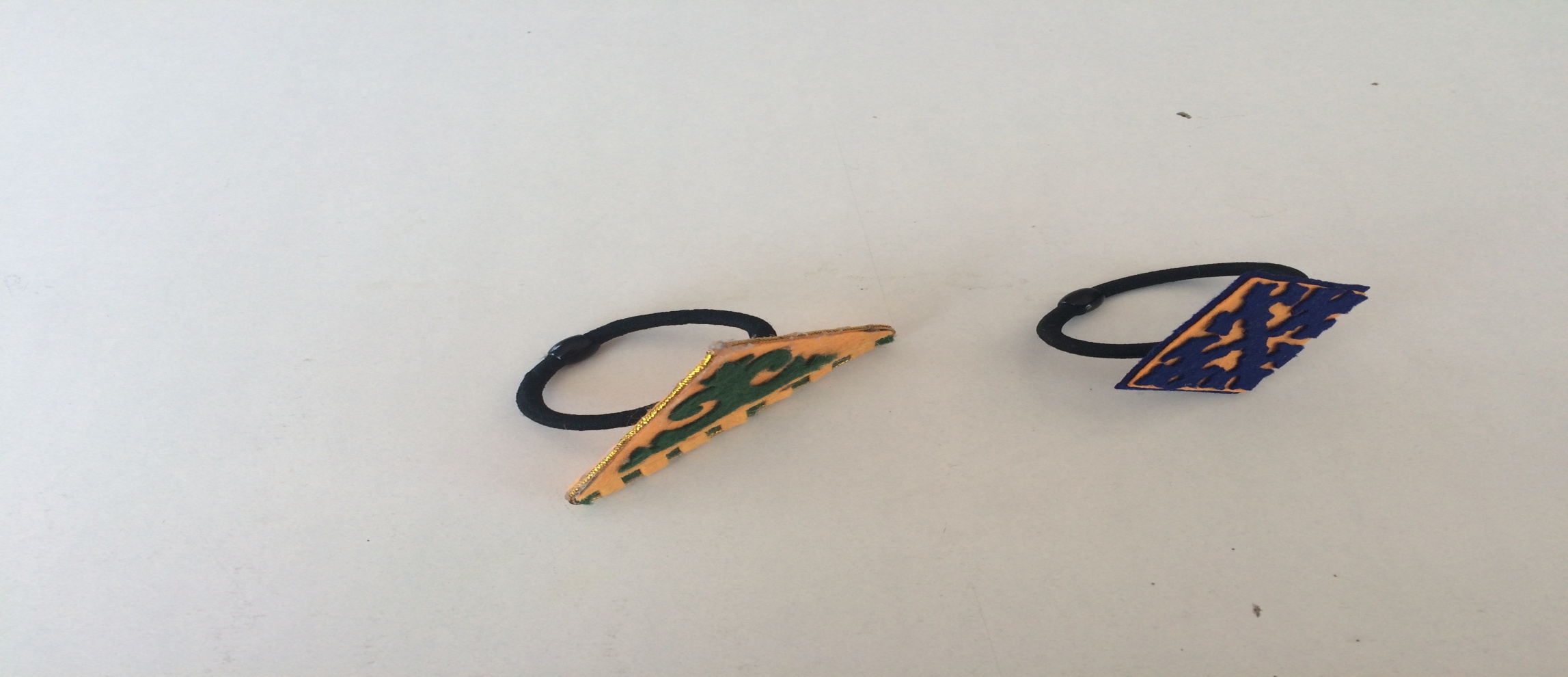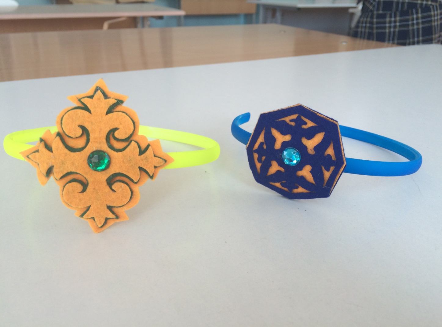 Қазақи нақыштағы шаш буғыштар.(Резинка) Бұларды жасауда қолданылған ою-өрнек түрлері: Қошқармүйіз оюы.Пішіндері: тұмарша, шаршы.