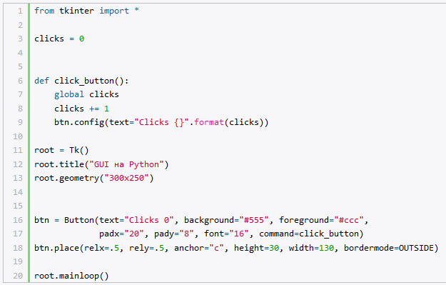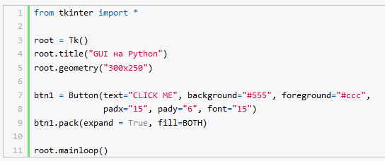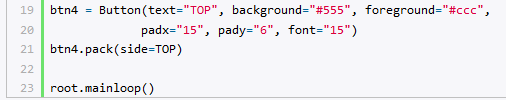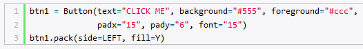 btn1 = Button(text="x=10, y=20", background="#555", foreground="#ccc", padx="14", pady="7", font="13")