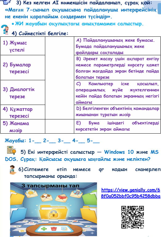 Жаңа материалды меңгеру Ұғымдаға түсініктеме береді: пайдаланушы интерфейсі, графикалық интерфейс (GUI), мәтіндік интерфейс, дауыстық интерфейс (VUI). Мысалдарды көрсету. Топтық жұмыс "Ыңғайлы интерфейс" - әр топ бағдарламаның интерфейсін критерийлер бойынша талдайды: қарапайымдылық, дизайн, қол жетімділік, кестені толтырады және жауаптарды ұсынады. Сергіту сәті