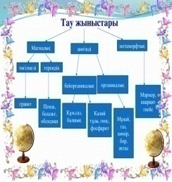 Ұйымдастыру: 1.Сәлемдесу, түгендеу, сыныпта жағымды атмосфера қалыптастыру. «Қарашығанақ мұнай кен орны» тақырыбында 1 минуттық бейнежазба көрсету арқылы оқушы назарын сабаққа аудару және тақырыпты болжау. 2. Оқушылар бейджик таңдау арқылы 3 топқа бөлінеді: 1-топ: Магмалық пайдалық қазбалар; 2-топ: Шөгінді пайдалық қазбалар; 3-топ: Метаморфтық пайдалық қазбалар; Топта басшы, хатшы, тайм-кипер, спикер, бағалаушы тағайындалады. Топ басшысы – топтағы топтық жұмыстың барлығын ұйымдастырушы; Хатшы - тапсырмаға байланысты негізгі және қосымша ақпараттарды жинаушы; Тайм-кипер – топтың тапсырманы берілген уақытқа сай орындауын қадағалаушы; Спикер – басқа топтар алдында өз тобының жұмысын қорғаушы; Бағалаушы – топ мүшелерінің қызметі мен белсенділігіне баға беруші және өзге топтарға өз тобының атынан ауызша кері байланыс жасаушы. Бағалаушыға әр тапсырманың соңында өз тобының мүшелерін бағалап отыруы үшін 3 түсті гүл күлтешелері ұсынылады. Жасыл түсті гүл – топтағы ең белсенді, топтық жұмыстың басым бөлігін орындаған топ мүшесіне ұсынылады; Сары түсті гүл - топтағы ең сыпайы, топтық жұмыстың орындалуына жеткілікті деңгейде көмектескен топ мүшесіне ұсынылады; Қызыл түсті гүл - топтағы белсенділігі аз, тақырыпқа байланысты ақпаратпен бөлісе алмаған топ мүшесіне ұсынылады; Үй тапсырмасы: «Кластер» әдісі арқылы тау жыныстарының қалыптасу заңдылықтарын анықта Кері байланыс: «Бас бармақ» әдісі