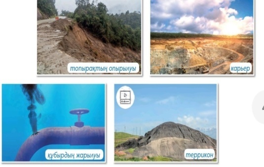 ҚБ 2-тапсырма Топтық жұмыс ОДД:білу,түсіну,қолдану Пайда мен зиян Фотосуреттерді сипатта. Пайдалы қазбаны өндіру қандай жағдайға әкеліп соғуы мүмкін? Осы салдарлардың қайсысының алдын алуға болады деп ойлайсың?
