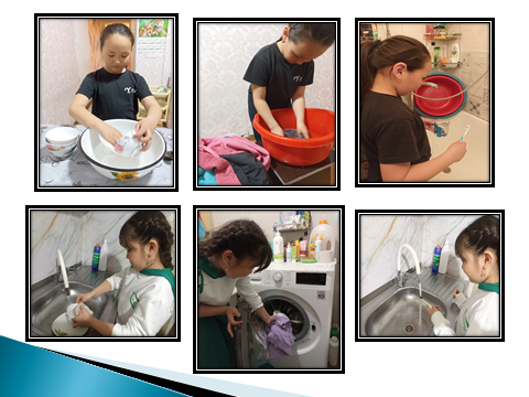 - Практикалық тапсырмалар: Оқушыларға нақты өмірмен байланысты мысалдар беру. Мысалы, 5-сыныптарда жаратылыстану пәнінен «Жердің құрлысы және оның қабықтары» тақырыбында гидросфера қабатына байланысты суды үнемдеу жолдарын практикалық түрде дәлелдеуге тапсырма бердім. 5-сынып оқушы Ертасова Камиланың практикалық жұмыс жасап келгенін көруге болады. Ол өзінің достарының 1 күнде қанша литр су жұмасайтындарын анықтаған.