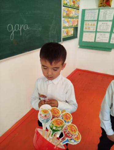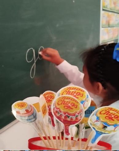 3.«Чупа-чупс» ойыны. Бұл ойында бала өзіне ұнаған чупа-чупсты алып,онда берілген сөзді оқиды және тақтаға жазады. Бұл ойын арқылы балада оқылым және жазылым дағдылары қалыптасады.
