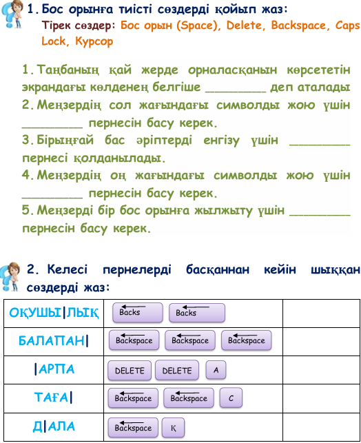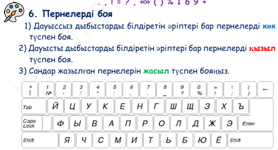 Бағалау критерийі: пернелер топтарын олардың мақсатына сәйкес ажыратады және дұрыс белгілейді. Дескрипторлар: * Дауыссыз пернелерді көк түспен дұрыс бояды. * Дауысты дыбыстардың пернелерін қызыл түспен дұрыс бояды. * Дұрыс сандар пернелерін жасыл түспен бояды. Бағалау критерийі: пернетақта пернелерінің мақсатын біледі және оларды теру және өңдеу кезінде қолданады. Дескрипторлар: * Пернелерді олардың функциялары бойынша анықтайды (Backspace, Delete, Space, Caps Lock, курсор). * Қателерді түзету тапсырмалары мен сөздер жиынтығын орындау кезінде пернелерді қолданады Бағалау: Мұғалім оқушылардың белсенділігін ескере отырып бағалайды Керемет! Жақсы! Талпын!
