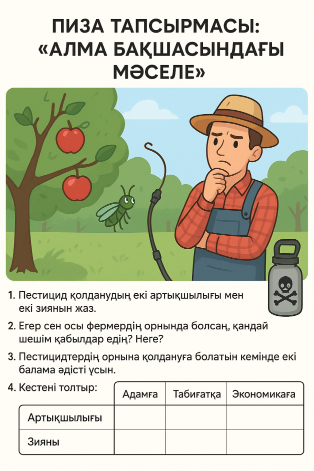 «Жұптық жұмыс» ФС тапсырмасы «Алма бақшасындағы мәселе» Ауылдағы бір фермер алма бақшасында зиянкестер көбейіп кеткенін байқайды. Ол өнімді сақтап қалу үшін пестицид қолданғысы келеді. Бірақ көршілері пестицидтің денсаулыққа және қоршаған ортаға зиян тигізуі мүмкін екенін айтып, қарсы болады.