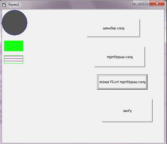1. Visual basic тілінде графикалық фигураларды қолдануға неше әдісі бар ?(3әдісі бар)