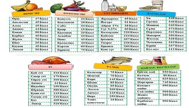 Тағамдар құндылығының кестесі (100г өнімдегі