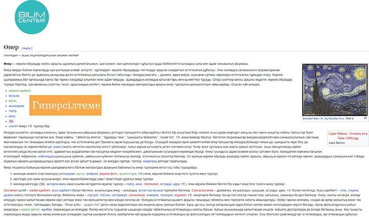 Жиі кездесетін гипермәтіннің үлгісі – бірнеше тармақтан тұратын құрылымдағы гипермәтін. Ол бірнеше мәтіннің басын біріктіріп, бірнеше оқу нұсқасына жағдай жасайды (мысалы, Википедияны оқып отырғанда бір сілтемеден бір сілтемеге ауысу; не болмаса рет-ретімен оқып шығу, мұндайда сілтемелерді не басынан, не аяғынан бастау талабы жоқ және с.с.). Төменде Википедиядан алынған «өнер» ұғымымен танысуға болады. Бір ұғымның аясында бірнеше сілтеменің көрсетілгеніне назар аударыңыз. (5- сурет)
