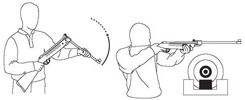 Түсіну Пневматикалық мылтықты оқтап, соққылық жағдайға келтіргенде, жеңіл әрекет ету қажет, оны сілкуге, жұлқып ашуға және тарс жабуға болмайды. Сұқ саусақты ағытқыш құйрықшасына перпендикуляр қояды. Тек ортаңғы саусақ мылтықтың сабын қармап ұстайды. Басбармақ, төртінші және кіші саусақ мылтық сабында тұрады. |
